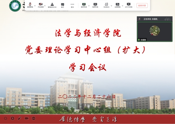 武科大网讯(通讯员胡诗绮)12月26日上午,法经学院党委在线上召开党委理论中心组(扩大)会议,邀请学校党委副书记孙国胜作党的二十大精神宣讲报告。学院全体领导班子成员、党委委员、党支部书记、系主任、中心主任、学生党员代表参加学习,学院党委书记张继才主持会议。