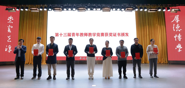 吕勇为在第十三届青年教师教学竞赛中获奖的教师颁奖,同时为获得我校本科课堂教学准入证的教师颁发准入证。