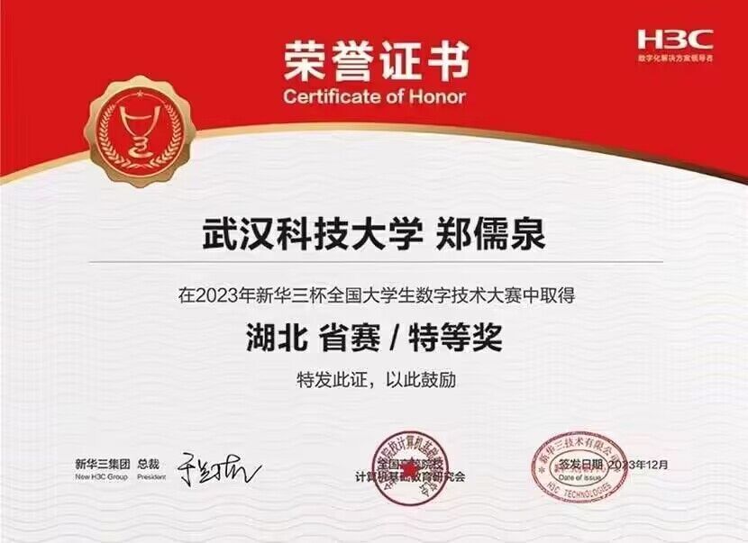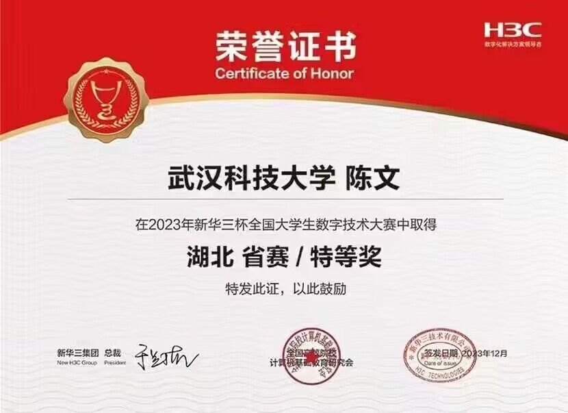 武科大网讯(通讯员苏鹏鹍)12月31日,第十三届“新华三杯”全国大学生数字技术大赛湖北省省赛获奖名单正式公布。由计算机学院教师古权、胡静指导的陈文、郑儒泉等多名学生积极参与赛事,斩获湖北省特等奖2项,一等奖2项,二等奖1项,三等奖1项。其中,斩获特等奖的陈文、郑儒泉分别位列第一、第三,打破我校该赛事获奖记录,顺利晋级国赛。